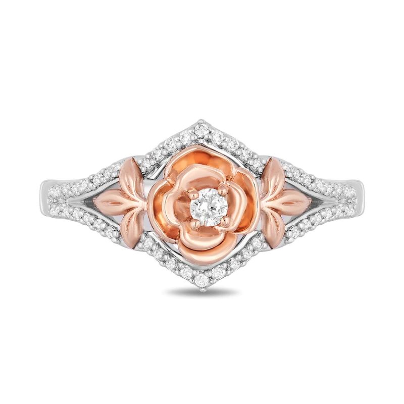 Displaying elegance this diamond rose ring is an unparallelled beauty. Crafted in sterling silver and 10K rose gold, this exquisite choice showcases a 0.04 ct. diamond shimmering in a radiant bloom flanked by trios of detailed leaves – all in rose gold. The diamond-lined chevron-shaped ribbons of the silver surround the centre in sparkle. Captivating with 0.18 ct. t.w. of diamonds and a bright polished shine, this design makes any day special.