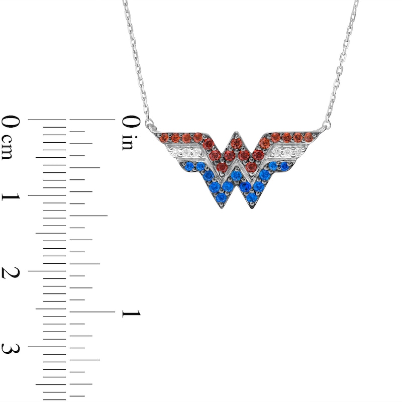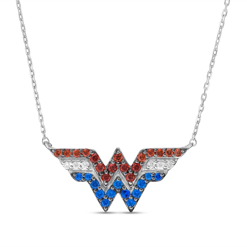 Crafted in sterling silver, this look showcases the "WW" logo lined in regal red garnets, bright blue sapphires and sparkling diamonds. Captivating with 1/20 ct. t.w. of diamonds and a brilliant buffed luster, this 1.0-inch design suspends centered along a 17.0-inch cable chain, with an additional closure ring at 16.0 inches, that secures with a spring-ring clasp.This exclusive fine jewelry collection inspires you to wear your strength, confidence and power.